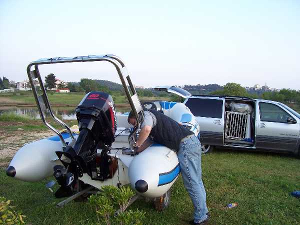 wir haben unseren kleinen in Kroatien immer mit dabei, das Booti fahren macht ihm Spass, stressig wirds immer nur beim Ankern, weil er nicht verstehen kann dass wir das schöne Ding immer wegschmeissen. Wir suchen uns prinzipiell ruhige Badeplätze. Im Auto (Pickup Mitsubishi L200) hat er eine grosse Flugbox in der er sich total wohl fühlt. Das zusätzlich angebrachte Gitter (sieht man am Bild wenn`s klappt) erlaubt es die obere Heckklappe während der Fahrt offen zu lassen. Wenn der Kofferraum am Campingplatz ausgeräumt ist hat er die ganze Ladefläche zur Verfügung, wo er zwecks sicherer Verwahrung auch immer ist wenn er nicht mit uns unterwegs ist. Das Auto steht im Schatten neben dem Zelt. Bodenhaken ist in nullkomma nix ausgerissen bzw. zerstört wenn er will. Ausserdem hat er schon einige schlecht genähte Lederleinen und Halsketten mit schlecht geschweissten Gliedern auf dem Gewissen (deshalb im Käfig verwahrt) Das mit dem Fell ist überhaupt kein Problem, so schön wie im Urlaub ist´s sonst nie. Gelegentlich wird es mit Süßwasser geschwemmt (trocknet dann besser weil Salz Wasser anzieht). Der natürliche Fettfilm schützt aber ganz gut. Der Durchfall nach übermässigem Salzwasserkonsum (passiert beim Dauerapportieren gelegentlich) ist auch kein Problem, wichtig ist nur, dass er die Möglichkeit hat genügend Frischwasser nachzutrinken. Theoretisch gibts die Möglichkeit einer Kochsalzvergiftung, passiert aber nicht weil normalerweise erbrochen wird bevor eine kritische Salzmenge aufgenommen wird. Obwohl wir selbst Tierärzte sind schaun wir auch wo ein Kollege ist, für den Fall dass es ein Problem gibt, dass wir nicht mit dem "Bordwerkzeug" lösen können. Gruss Udo |