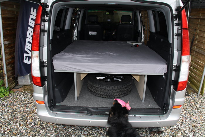 Ich hab den Viano EXTRA-Lang 2,2 CDI Automatik+ALLRAD. Wir haben uns hinten ein Bett 190 x 140 eingebaut. Vor dem Bett ist immerhin noch über ein Meter Platz bis zu den Fahrersitzen.